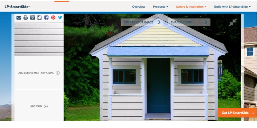 LP Smartside – they offer custom looks at siding, accent siding, brick/stone, and trim. Their tool offers a unique feature allowing you to adjust the perspective and brightness of your photo. On the downside, I couldn’t find a measuring tool, so everything looked comically oversized on the little cottage image I used.