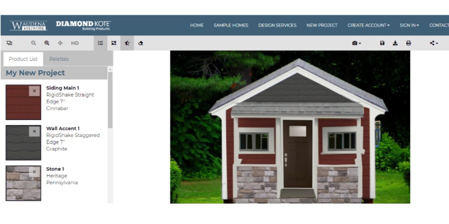 Waudena Millwork/Diamond Kote – This tool offers the most options of any I tried, including roofing, siding, accent siding, stone/brick, trim, matching paint for doors and shutters, and exterior doors complete with lock and handle options. This tool is recently updated with a lot of great features, including the Google Street View option I mentioned above.