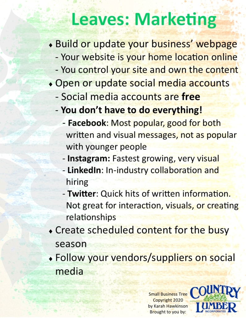 – There are many other social media platforms (Snapchat, TikTok, YouTube, Pinterest, etc.). I’ve just hit on a couple of the big ones that are most likely to be beneficial for Country Lumber’s small business clients. For a more in-depth look, or to explore some of the platforms I left out, check out this article from Adobe.
