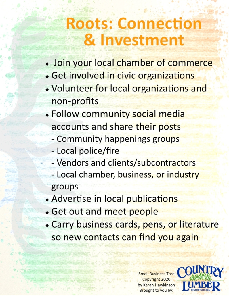 – Community involvement (roots) is a form of marketing, too. Support a local non-profit or kids sport/activity, participate in the chamber of commerce, or have a float in the summer parade.