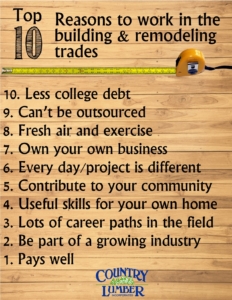 There are lots of reasons to love a career in the building and remodeling trades. Here are our top ten.